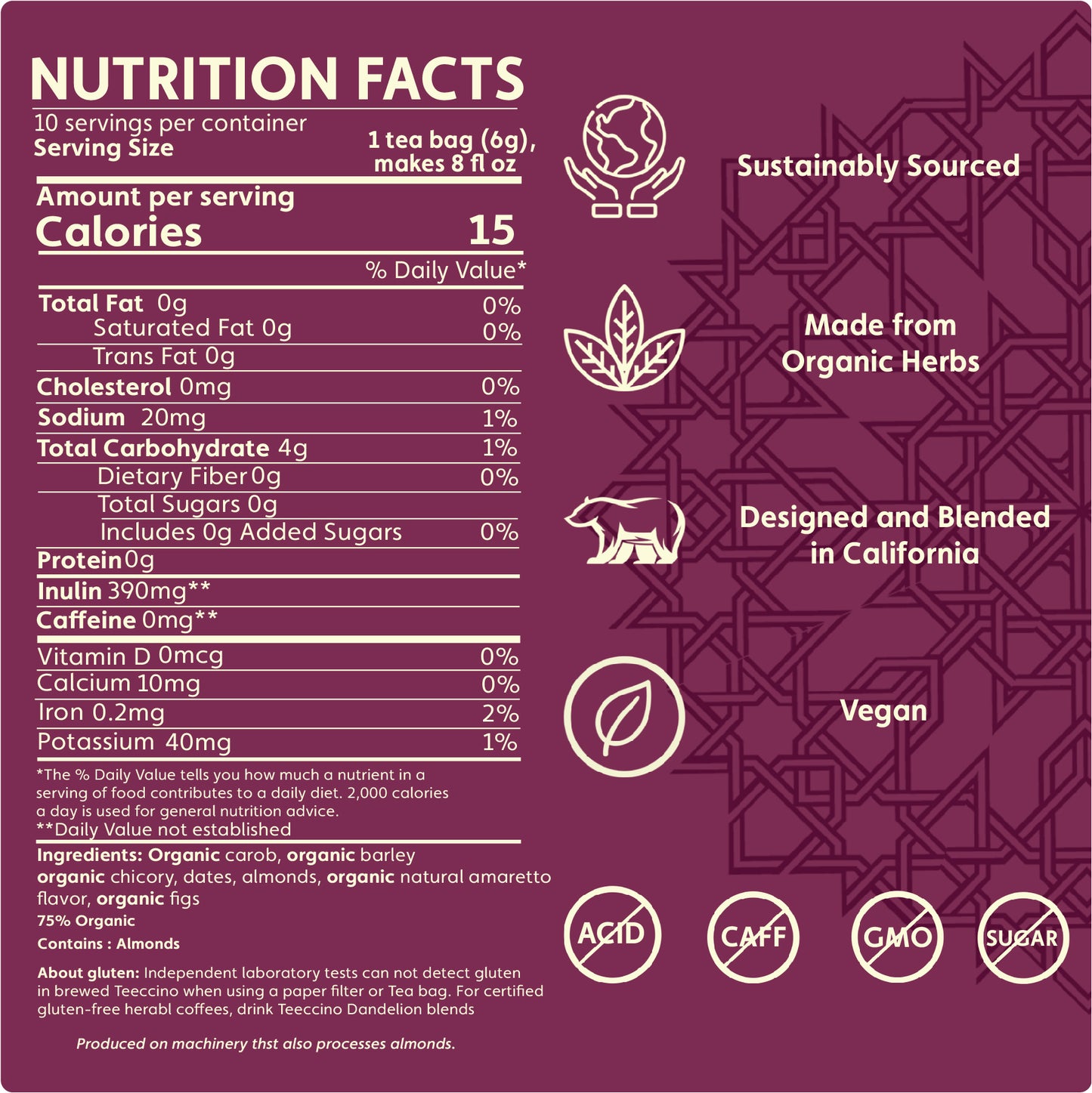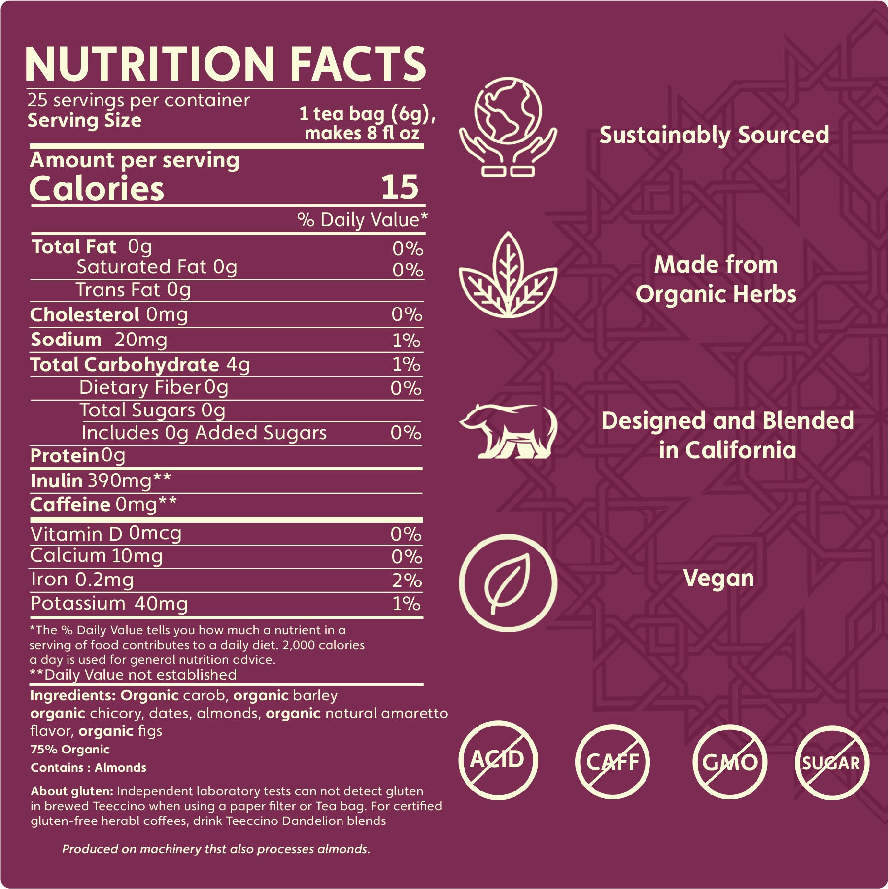 Transport yourself to a peaceful time with Teeccino Almond Amaretto. Enjoy the Italian flavors of fruit, herbs, and nuts in every sip.