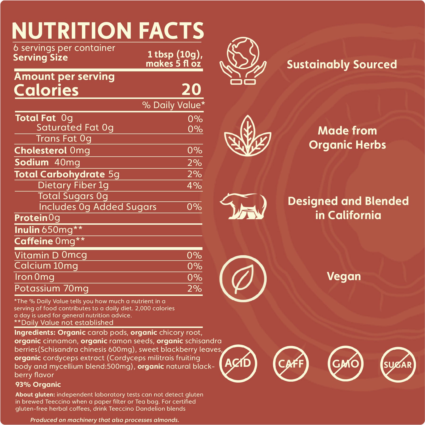 Teeccino’s selection of adaptogenic mushrooms optimally paired with adaptogenic herbs are blended to enhance their combined wellness benefits. “Fruiting bodies” are what we think of as mushrooms while mycelium are like the roots and branches of mushrooms. I decided to include both parts of the mushrooms in Teeccino Mushroom Adaptogen Herbal Coffees because each provides valuable health benefits. The synergy of all these mushroom and herbal adaptogens blended together brings delicious well-being to your cup.