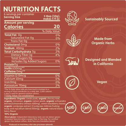 Cordyceps, the Himalaya’s rare mushroom touted for improving stamina, libido and longevity, is paired with schisandra, the five-flavored berry with tonic, revitalizing properties. Blended with prebiotic chicory and Vietnamese cinnamon, experience bold, spicy flavor with adaptogens protecting your mind and body!