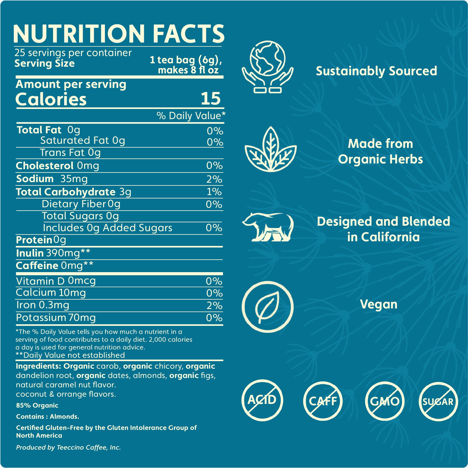Teeccino's Dandelion flavors are the only brand of coffee alternatives that are certified gluten free and 100% grain free. Enjoy Teeccino's deliciously rich, deep-roasted flavor that delivers all the satisfaction without the caffeine and acidity of coffee. The secret? French chicory the roasted root often added to coffee blended with dandelion root, the renowned detox herb, and Spanish carob famed for its chocolatey flavor. Enriched with California's almonds, dates and figs, a cup of Teeccino brims with many health benefits.