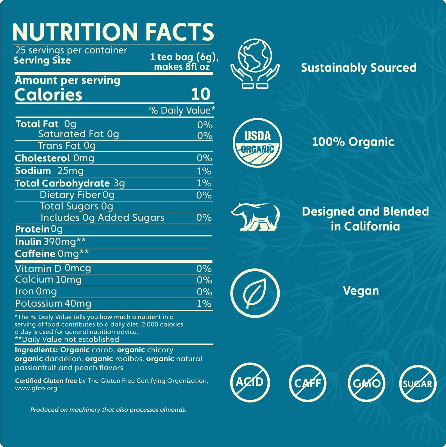 That was the thought that propelled me to my kitchen lab to give it a whirl. It was hot out. As I layered passionfruit and peach flavors over full-bodied red rooibos leaves along with some bitter depth from dark roasted dandelion and chicory roots, the idea of a glass of iced passionfruit peach Teeccino became irresistible. I blended, brewed, chilled and voila! Teeccino Passionfruit Peach came into being. We hope you enjoy this fruity version of Teeccino as much as we do here in Santa Barbara!