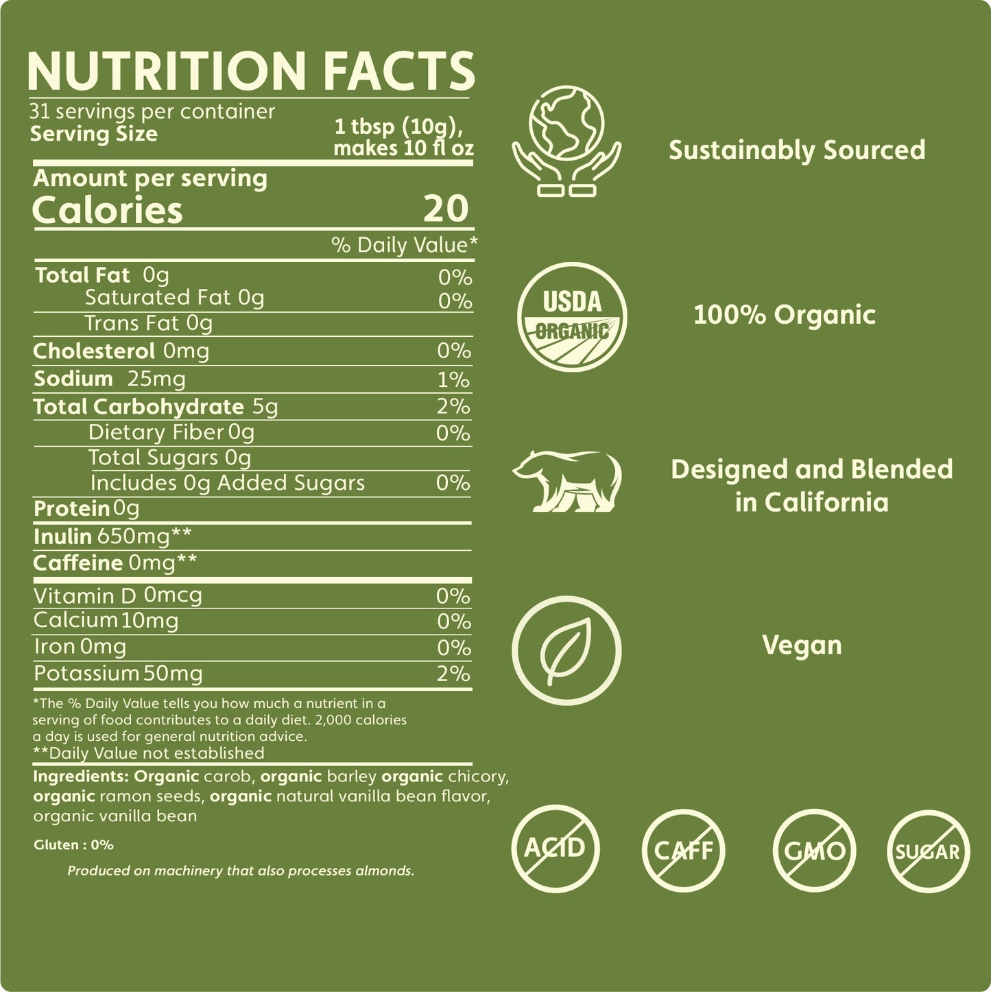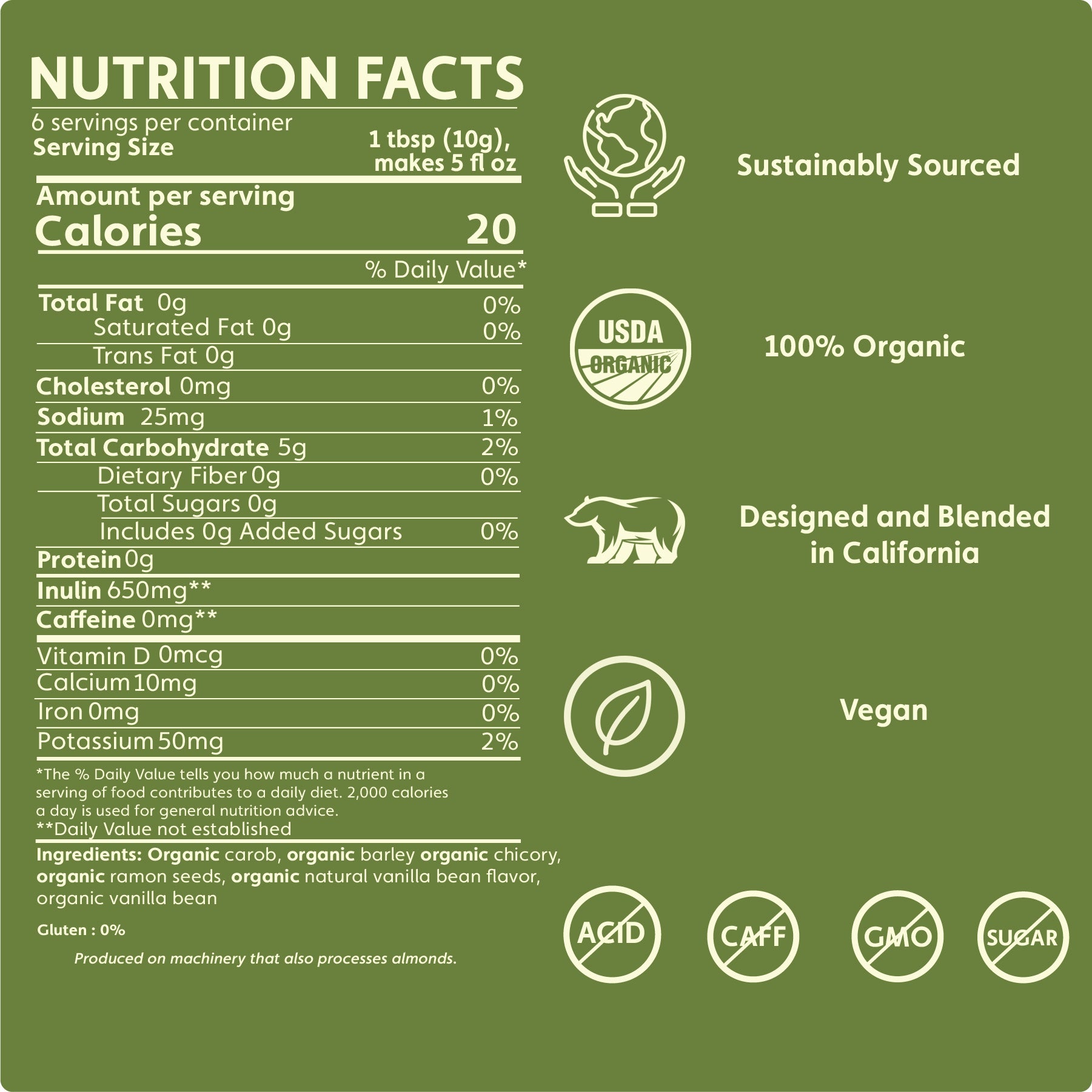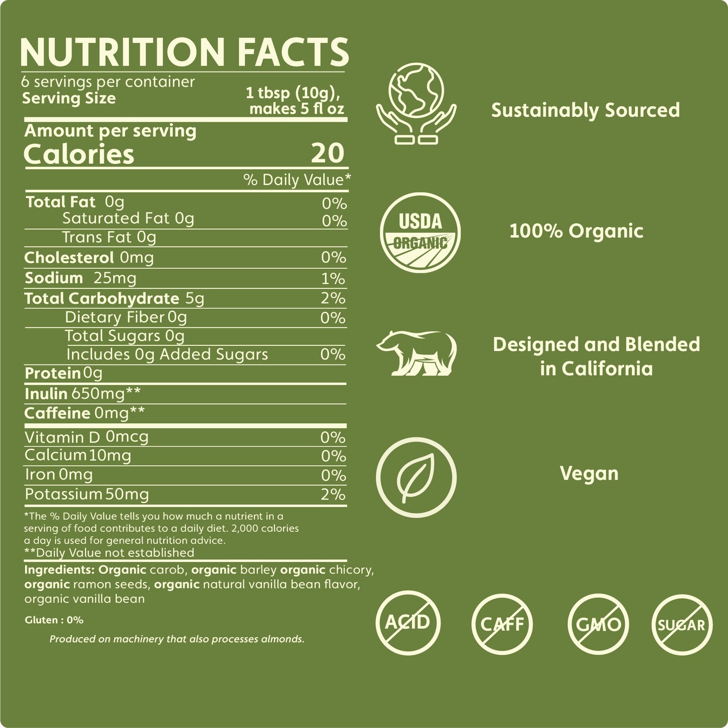 The French take credit for bringing vanilla beans to the Bourbon Islands where a French-owned 12-year-old African slave, named Edmund Albius, figured out how to hand pollinate the flowers and produce fragrant vanilla beans. Thus Teeccino French Vanilla reunites the Maya's dark roasted ramón seeds with French Bourbon vanilla for a taste experience that reflects the best ingenuity of native people in both Mexico and Madagascar!