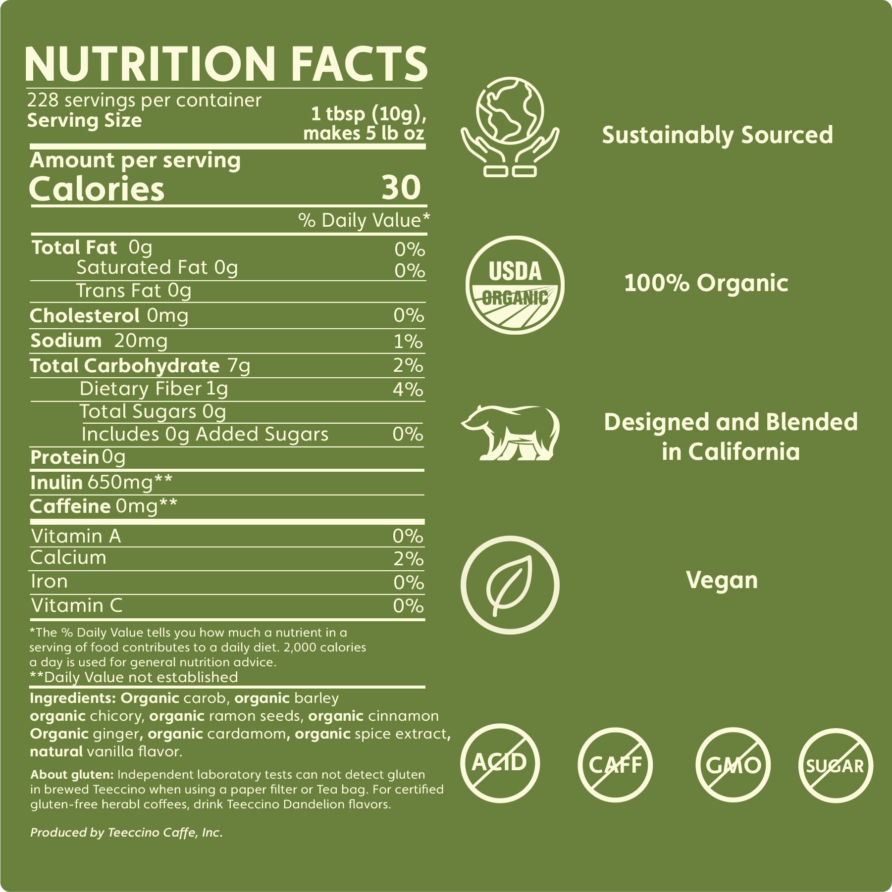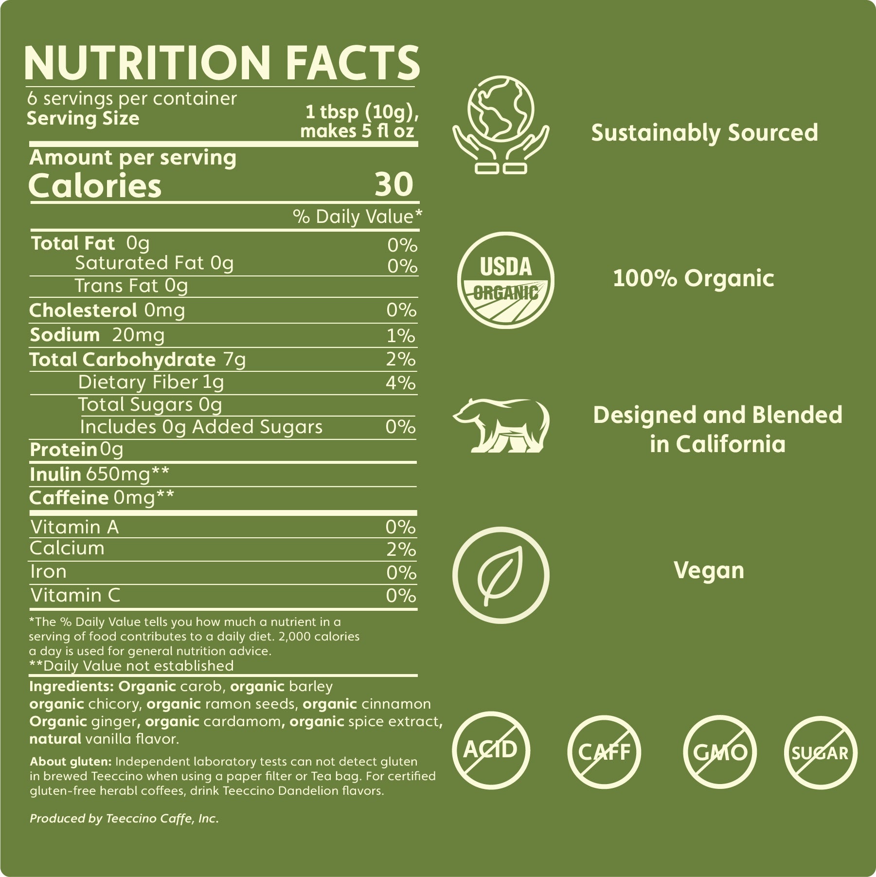 Pure instant Teeccino with no added creamer. Just stir into hot water for fast, bold flavor.
