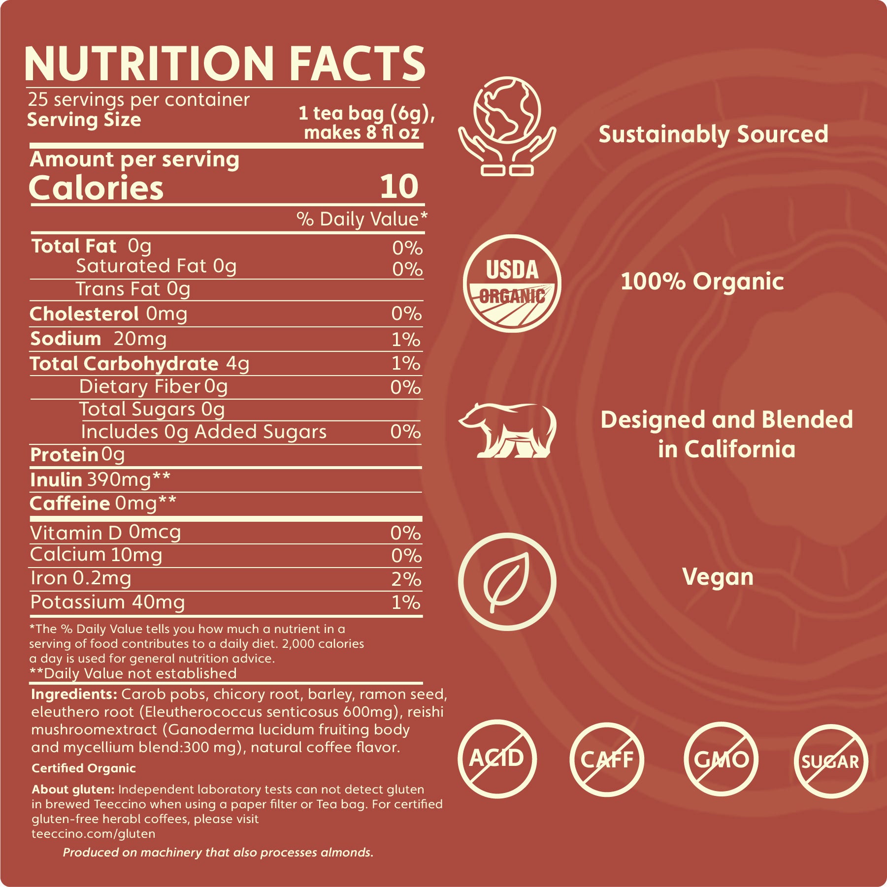 Reishi, Asia’s famed health-promoting mushroom, enhanced with Siberia’s gold-standard adaptogen, eleuthero, plus deep, rich coffee-like flavor from roasted chicory and ramón seeds.