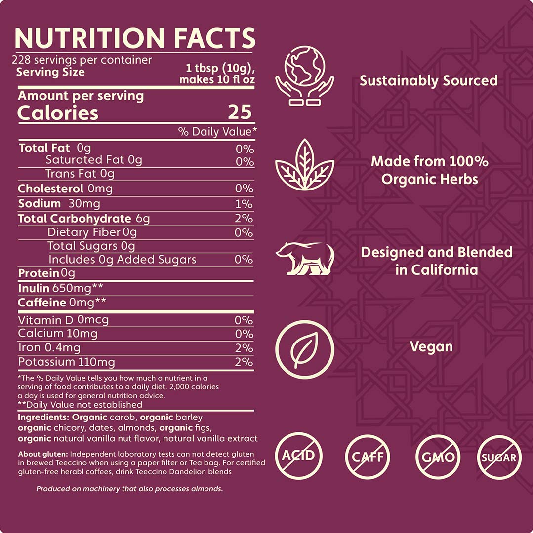 Pure instant Teeccino with no added creamer. Just stir into hot water for fast, bold flavor.